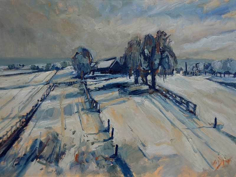 Ce magnifique paysage est situé dans un petit village suisse du canton d'Argovie. J'ai peint cette œuvre à partir d'une photographie. Le créateur de la photo m'a autorisé à l'utiliser comme référence pour cette peinture. Les magnifiques champs en pente recouverts de neige avec ici et là un arbre fruitier standard me rappellent ma…