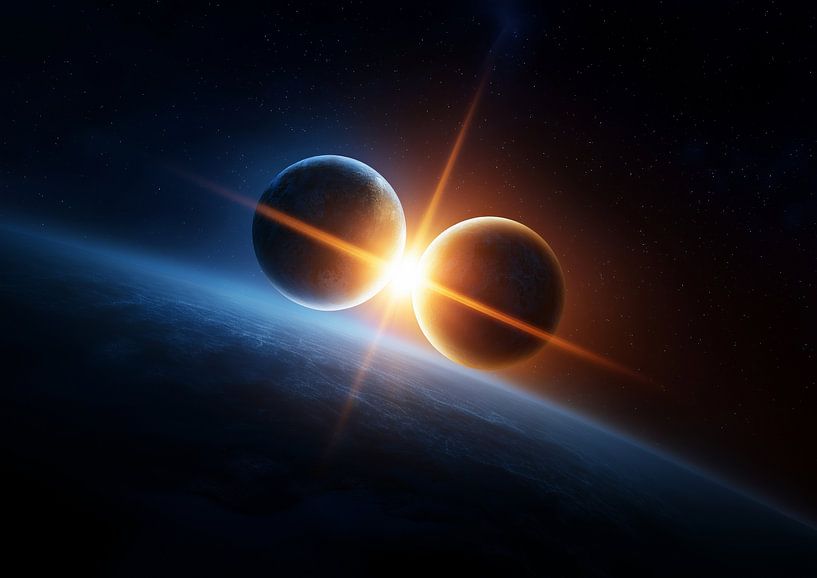 Achetez cette œuvre d'art abstraite Collision de planètes interstellaires et faisceau de lumière cosmique - Art par BINEDITS sur toile, aluminium, ArtFrame ou photographie (encadrée), impression d'art en haute qualité et tout format.