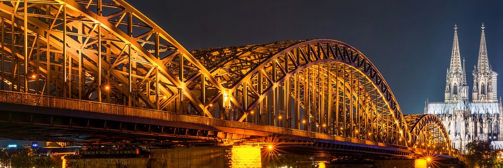 Panorama de Cologne la nuit, avec le pont Hohenzollern, la cathédrale de Cologne, le Rhin et l'opéra.