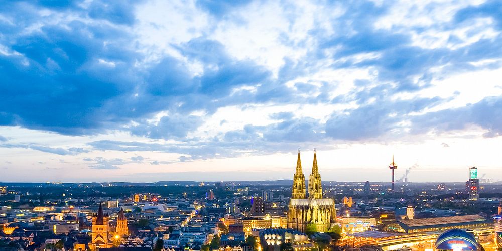 L'horizon de Cologne avec la cathédrale de Cologne et le pont Hohenzollern au crépuscule.