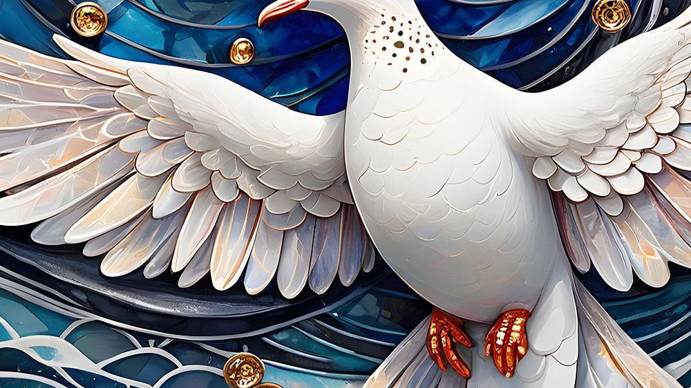 Cette image montre une majestueuse colombe blanche, aux ailes magnifiquement détaillées, qui semble planer au-dessus d'un arrière-plan de vagues fluides et de fleurs délicates. La colombe, d'apparence sereine, est entourée d'éléments détaillés en or, rouge et bleu, créant un sentiment de mouvement et d'harmonie.