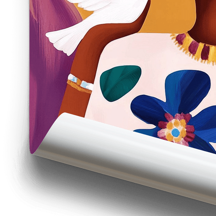 Colombe de la paix : illustration colorée d'une jeune femme avec une colombe blanche. Un accroche-regard particulier pour votre intérieur ! Une œuvre à message.
