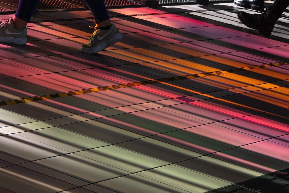 Ces couleurs et le jeu de lignes sur le sol de la gare centrale d'Amersfoort sont nés de la présence d'un grand autocollant coloré sur la fenêtre. Ces personnes sont aux portes de la sortie et sortent. Un peu plus tard, le soleil était différent et les couleurs étaient moins belles et moins intenses.