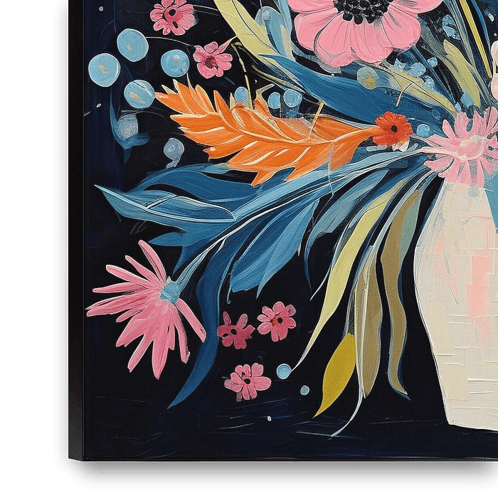 Colourful Harmony | Nature morte aux fleurs colorées - Cette peinture vibrante représente un vase contenant un bouquet luxuriant, jouant avec les contrastes de fleurs roses, orange et jaunes sur un fond bleu foncé. L'œuvre rappelle une interprétation moderne des arrangements floraux classiques, avec des feuilles stylisées et des formes de fleurs qui ajoutent à la fois du charme et du dynamisme à une pièce.