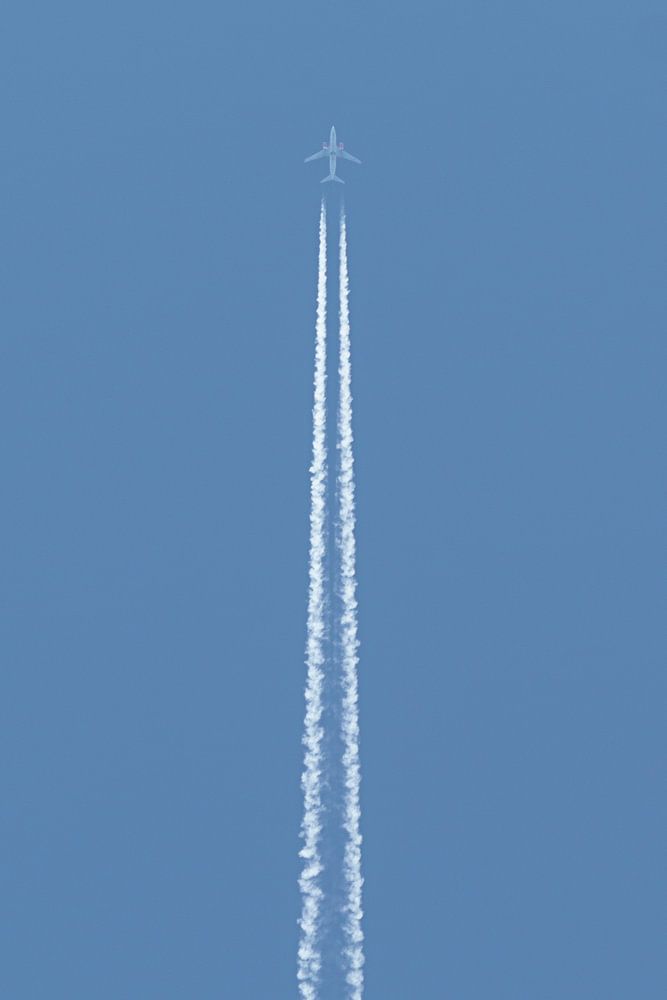 Vliegtuig met condensspoor doorkruist een strak blauwe lucht. Ga je mee op vakantie?