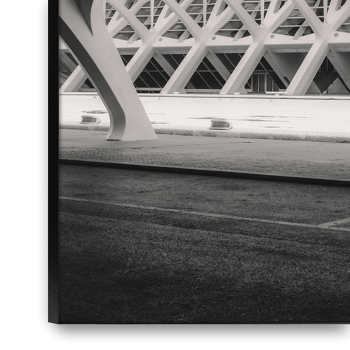 Le deuxième tableau fascine par son esthétique froide en noir et blanc et par le jeu graphique des lignes et des formes. Grâce aux colonnes marquantes du premier plan, l'architecture de la Ciutat de les Arts i les Ciències est mise en scène et acquiert une profondeur presque sculpturale. Les couleurs monochromes soulignent la structure…