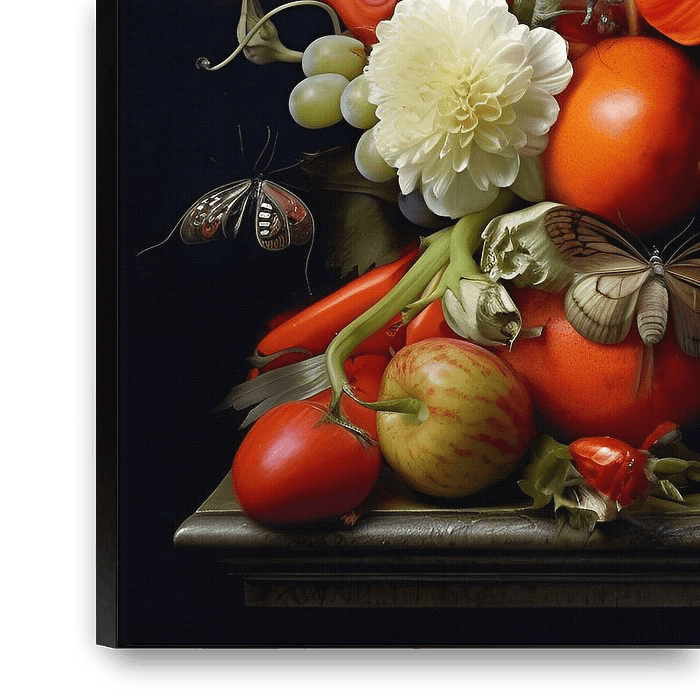 Une image générée par l'IA. Une composition de fleurs, de fruits et de papillons. La représentation rappelle les peintures à l'huile des maîtres anciens. Très décoratif sur de nombreux murs.