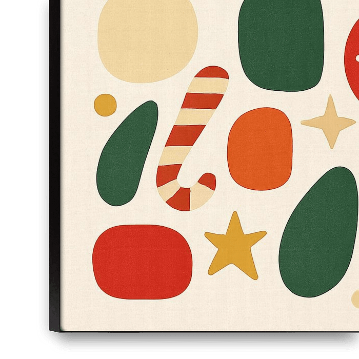 Cette œuvre d'art est une réinterprétation ludique et moderne des symboles classiques de Noël, sous la forme d'une composition vibrante de formes géométriques douces. Au premier coup d'œil, on remarque des éléments familiers des fêtes de fin d'année : des feuilles de houx avec des baies dorées, des cannes à sucre rayées, des ornements…