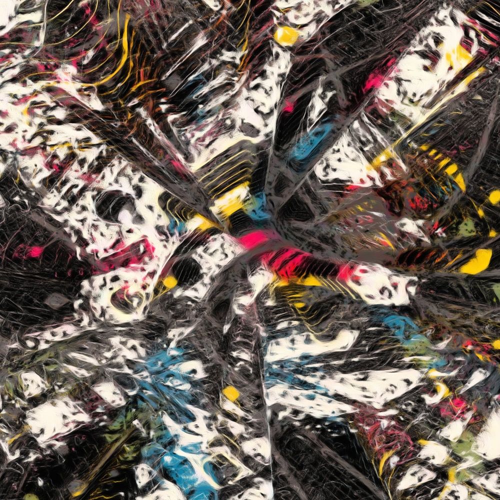 Peinture numérique abstraite à la gouache dans les tons bleu, rouge et jaune avec du noir.