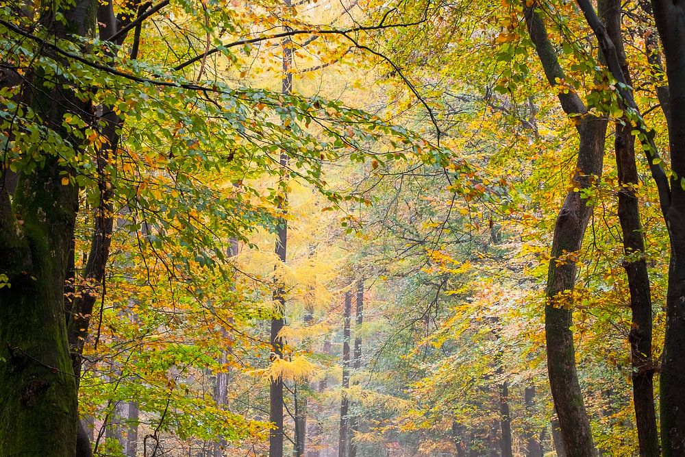 Des arbres aux feuilles d'automne colorées par un matin brumeux dans la forêt.