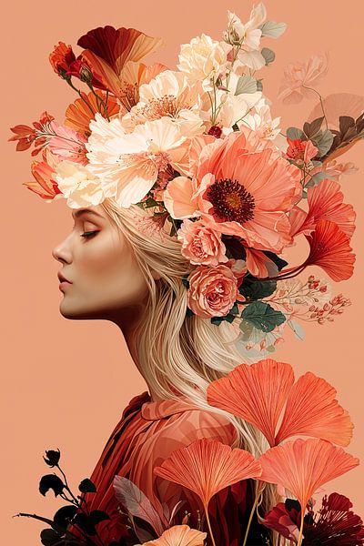 Un portrait captivant où un profil féminin se fond dans une luxuriante cascade de fleurs et de feuilles aux chaudes nuances de rose et de corail. L'œuvre mêle la beauté humaine à l'élégance végétale, révélant des pensées telles de délicates fleurs émergeant de son esprit. La palette de couleurs subtile et la superposition translucide…