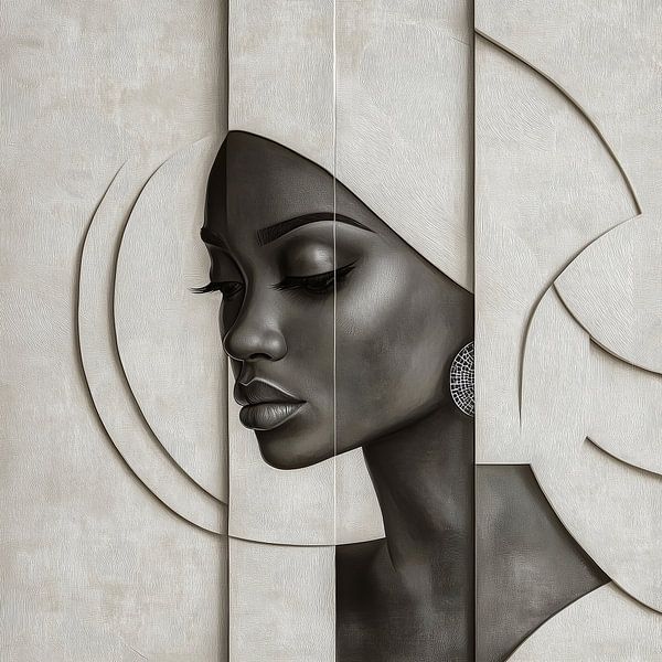 L'œuvre reflète une harmonie entre l'humain et l'abstrait, un concept central dans ce portrait. L'œuvre représente une femme à la peau sombre vue de profil, le regard vers le bas, suggérant un moment d'introspection ou de contemplation sereine. Sa boucle d'oreille ronde accentue subtilement son profil, un point focal qui souligne la présence humaine dans un environnement plein de structures et de formes.