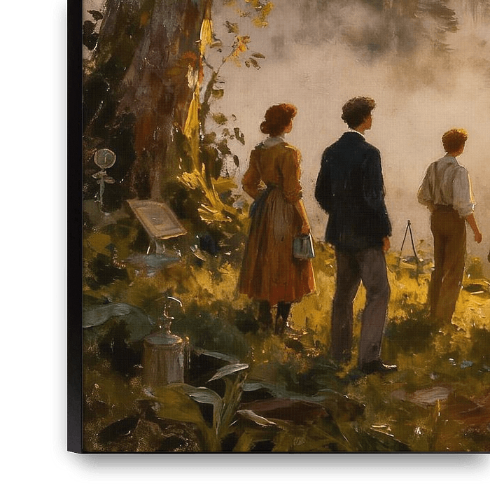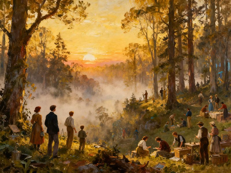 Ce tableau riche en détails représente un groupe de personnes réunies dans un paysage forestier baigné de lumière. La scène dégage un sentiment de communauté, de créativité et d’appartenance. Les chauds rayons du soleil percent la brume matinale et baignent les environs d'une lumière dorée. La multitude de personnages et d'activités…