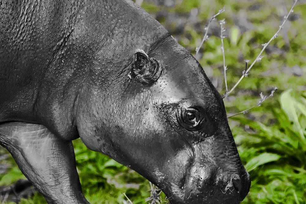 Achetez cette photo Cool hippopotame noir et blanc décoloré marche sur un fond d'herbe vert vif par Michael Semenov sur toile, aluminium, ArtFrame ou photographie (encadrée), impression d'art en haute qualité et tout format.