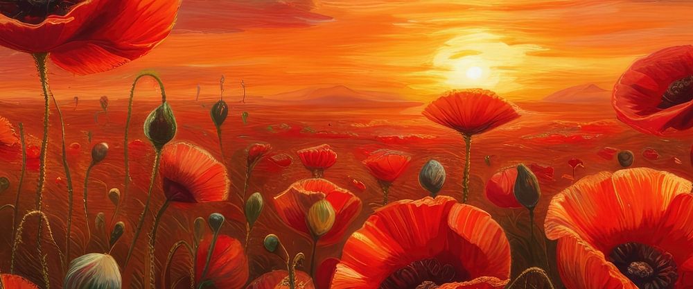 Une impressionnante peinture à l'huile révèle la magie d'un coucher de soleil sur une vaste prairie. Des coquelicots rouges s'épanouissent au milieu d'une verdure luxuriante, tandis que le soleil déverse ses derniers rayons sur le paysage. Les pétales des coquelicots semblent presque vivants dans la douce lumière du soir.