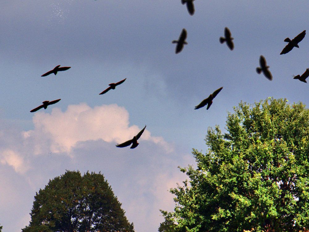 Corbeaux volants au-dessus d'un champ de maïs récolté à Herten