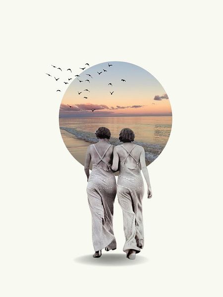 Deux femmes, cheminant ensemble, sur fond paisible de mer et de ciel. L'image respire la simplicité et la proximité, avec beaucoup d'espace et de lumière. J'ai réalisé cette œuvre à partir d'un désir d'être ensemble sans mots, du sentiment qu'on n'est pas obligé de marcher seul. Un collage calme et serein qui apporte chaleur et…