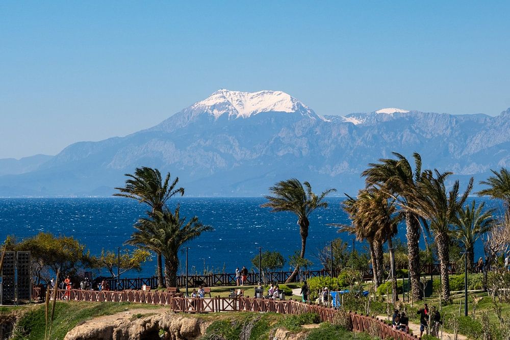Ce paysage côtier de rêve montre les falaises spectaculaires d'Antalya surplombant le bleu profond de la Méditerranée. Des palmiers bordent les plateformes d'observation, tandis que les montagnes enneigées du Taurus se dressent majestueusement à l'horizon. Les visiteurs profitent ici de l'une des plus belles vues panoramiques de la Riviera turque. Les sentiers de randonnée bien entretenus et les rampes en bois permettent d'explorer en toute sécurité ce décor naturel impressionnant. Un endroit parfait pour des photos de vacances inoubliables et des moments de détente au bord de la mer.