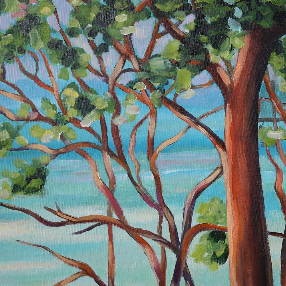 Quel beau voyage à travers l'Australie. Nous nous sommes promenés à Noosa heads. La couleur de la mer était si bleue. De retour à la maison, j'ai immédiatement pris le pinceau et j'ai peint cette toile. À l'ombre des arbres, regardez la mer claire.