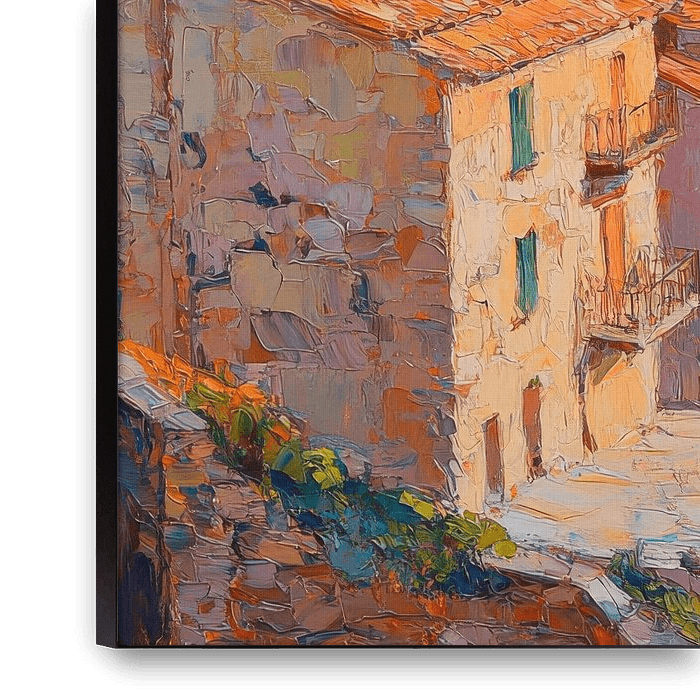 Un pittoresque village côtier se blottit contre les rochers, tandis que le soleil embrasse doucement le ciel de ses couleurs chaudes. Les toits de tuiles rouges des maisons contrastent harmonieusement avec le bleu éclatant de la mer et la douce brise. Les nuages dansent au-dessus du paysage, la scène calme dégage une beauté intemporelle.