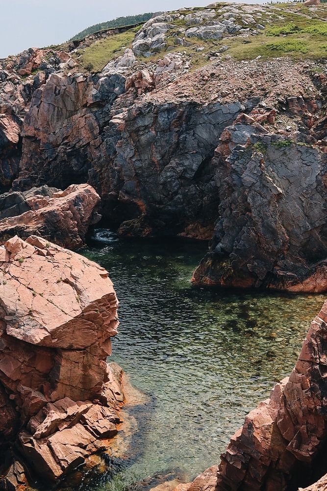 Un rivage rocheux à White Point, en Nouvelle-Écosse. L'eau y est merveilleusement claire et les rochers sont d'une belle couleur orange.
