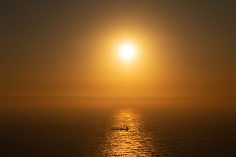 Magnifique coucher de soleil au Cap. Un beau soleil bas avec un cargo au milieu.