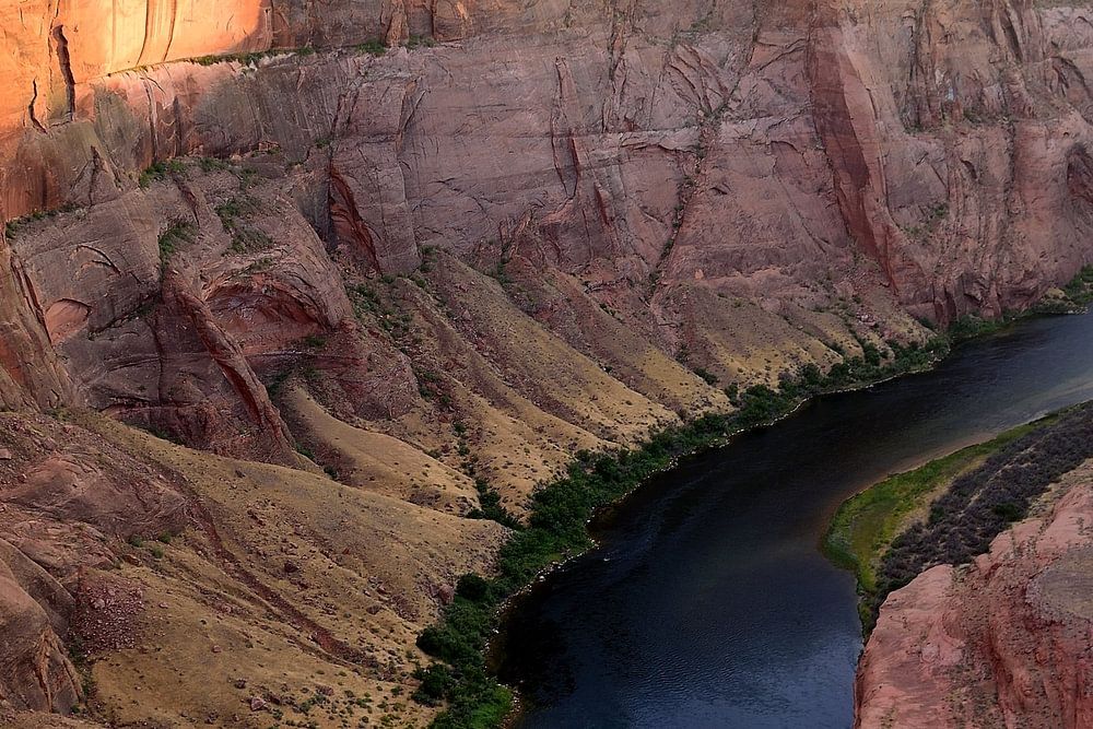 Environ dix minutes avant le coucher du soleil à Horseshoe Bend près de la ville de Page en Arizona, USA. La lumière du soleil brille encore abondamment sur les hautes falaises à gauche.