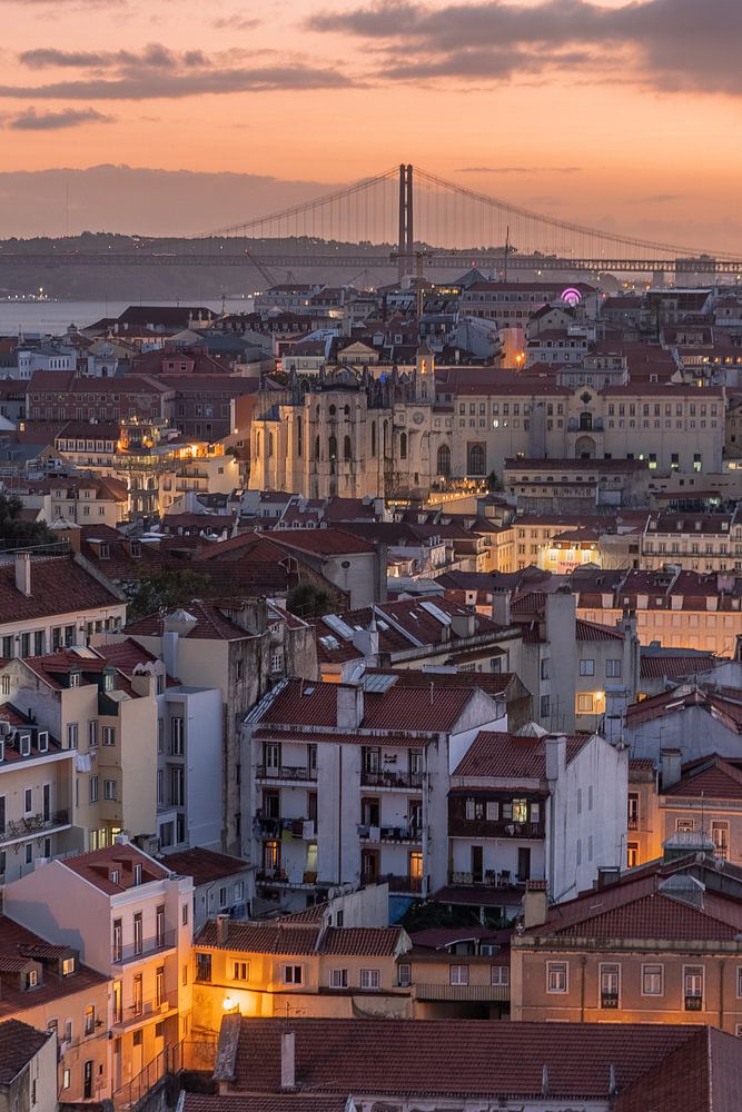 Photo allongée du coucher de soleil à Lisbonne du Miradouro Sophia de Mello Breyner Andressen (Miradouro da Graça). Cette image est également disponible sous la forme "paysage" format disponible.