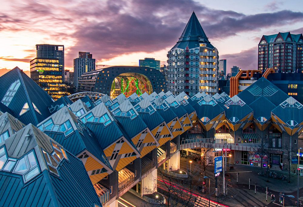 Le soleil s'enfonce sous l'horizon et colore le ciel en bleu-violet. Dans le même temps, le trafic de travail intense passe sous les Maisons Cube. Quelques icônes de Rotterdam, telles que la Station Blaak, le Market Hall et le Pencil ne semblent pas déranger à l'heure de pointe.