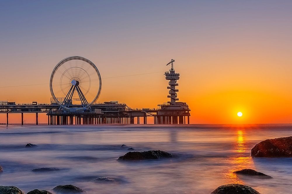 C'était une froide soirée d'hiver en février. Je suis allé photographier le soleil couchant et la jetée sur la plage. Le soleil s'enfonçait doucement dans la mer. Le ciel devenait orange. C'était un beau coucher de soleil calme sur la plage de Scheveningen avec une vue magnifique sur la mer du Nord. La photo en exposition longue a un bel effet avec la grande roue et l'eau.
