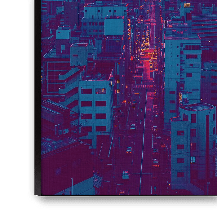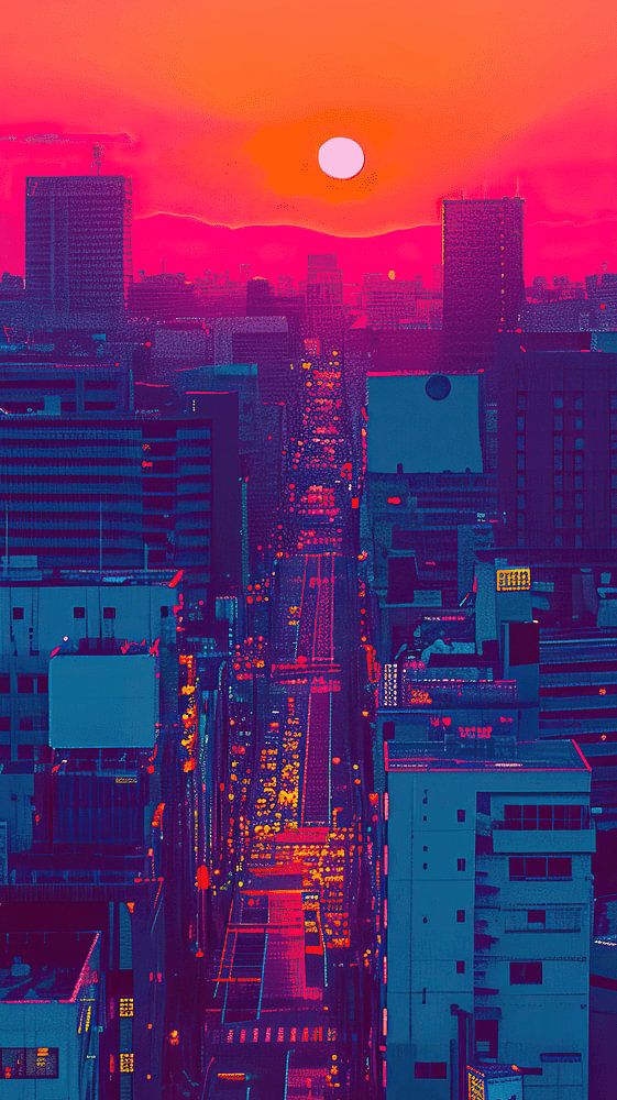 Cette image montre un paysage urbain lors d'un coucher de soleil, avec une esthétique néon colorée et vibrante. Cette image générée numériquement donne l'impression d'une photographie éditée avec des couleurs intenses. Le ciel est un mélange de teintes rose vif et orange, tandis que la ville en contrebas est dominée par des bleus et des violets froids. Les rues sont éclairées par les lumières des voitures et des bâtiments, ce qui crée une atmosphère dynamique et énergique. Le soleil au centre de la composition attire l'attention et ajoute un sentiment de chaleur et de concentration à la scène.
