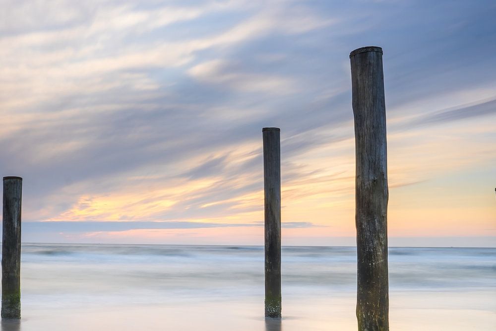 J'ai pris cette photo pendant nos vacances dans le nord de la Hollande. Quel beau coucher de soleil au bord de la mer et de la plage de Petten. Il y a de belles nuances dans le ciel. La marée est déjà assez haute, les poteaux de la plage sont déjà dans l'eau.