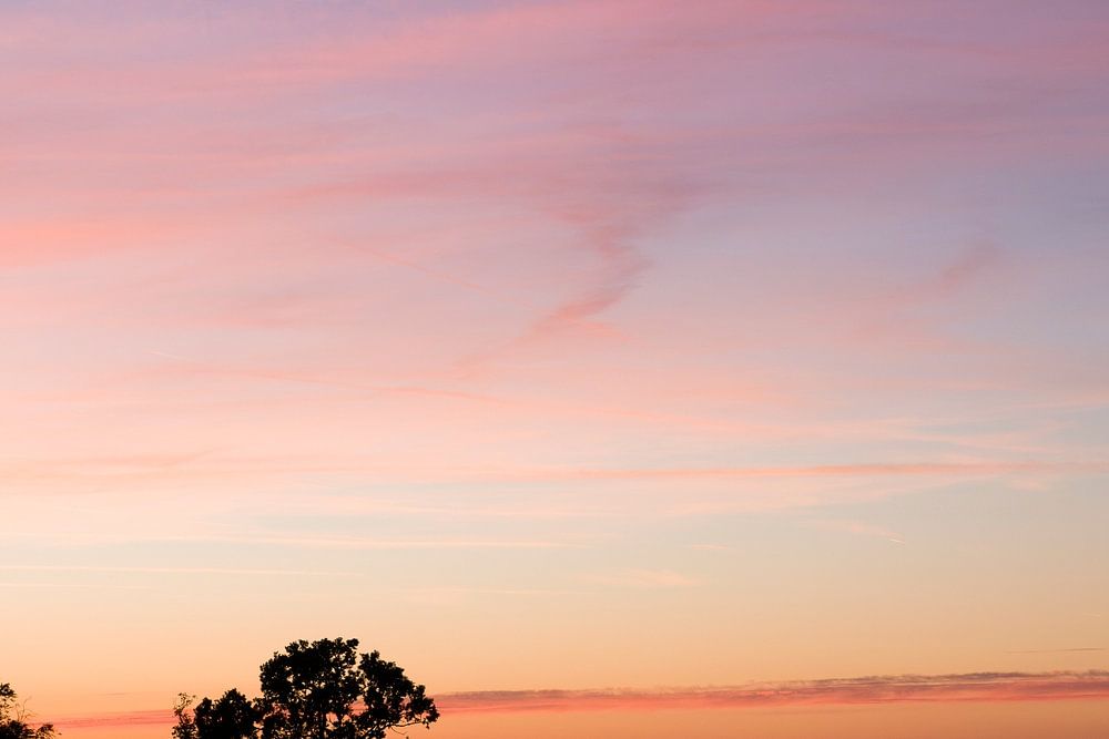 Cette photo a été prise près de Crozon-zur-Vauvre dans la province de l'Inre en France. Le soleil, caché derrière les collines et les arbres, crée un beau contraste avec le premier plan et le ciel, créant une silhouette forte. De plus, les nuages fins dans le ciel créent un magnifique jeu de couleurs rouge, orange, violet et bleu.