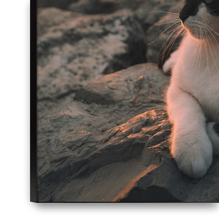 Cette photo d'ambiance capture un chat détendu, allongé sur les rochers au bord de la mer et regardant le coucher de soleil. L'ambiance lumineuse chaude baigne le pelage de l'animal dans des couleurs douces et fait apparaître les contours dans les moindres détails. Le ciel est recouvert de nuages délicats et se colore de douces teintes…