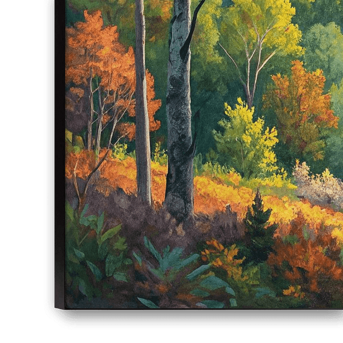 Cette superbe peinture à l'huile capture la beauté époustouflante d'une forêt au cœur de l'automne. Un chemin serpente à travers une colline embrasée par les couleurs riches et chaudes du changement de saison, des rouges profonds et des oranges brûlés aux jaunes brillants et aux verts éclatants. Le premier plan est dominé par deux arbres proéminents, dont les silhouettes distinctes ajoutent de la profondeur et de l'échelle. L'un, un pin imposant, s'élève vers le ciel, tandis que l'autre, un bouleau argenté, se tient gracieusement à ses côtés. Au loin, des montagnes d'un bleu brumeux s'estompent à l'horizon sous un ciel doux et doré. Les coups de pinceau épais et expressifs donnent vie à la scène, évoquant la sensation d'une promenade fraîche et tranquille dans l'après-midi. Cette œuvre est parfaite pour ajouter une touche de beauté naturelle, de tranquillité et de couleur vibrante à n'importe quel espace.