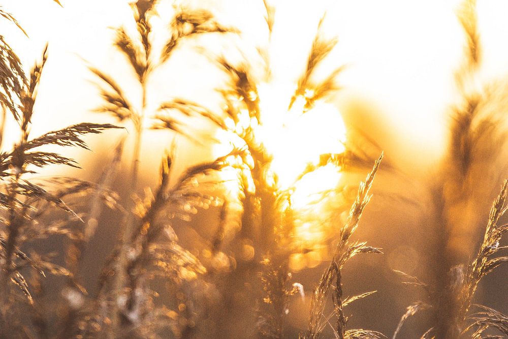 Coucher de soleil en gros plan de brins d'herbe et de roseaux par Marjolijn Barten