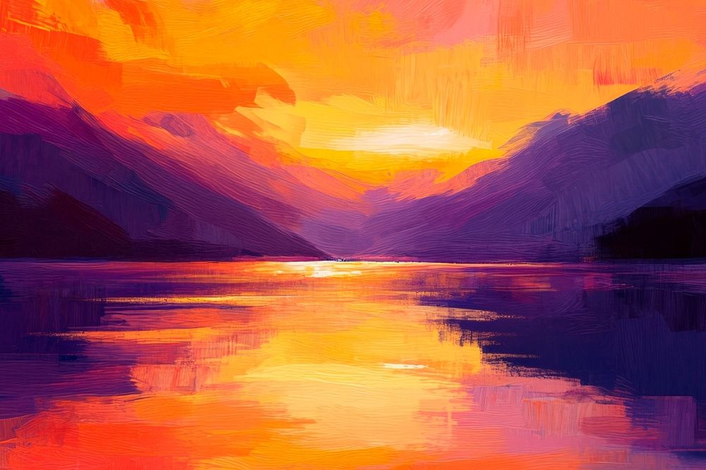 Un coucher de soleil spectaculaire plonge le monde dans des couleurs vives, tandis que les douces vagues de l'eau se reflètent dans la lumière pittoresque. La fusion harmonieuse du violet, de l'orange et du rose crée une atmosphère apaisante, idéale pour le salon, où calme et inspiration vont de pair.