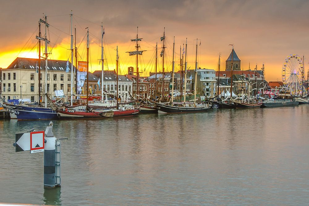 Vue sur le quai et le port d'une vieille ville hanséatique sur la rivière: De IJssel dans la province d'Overijssel. Le soleil se couche lentement et les nuages de pluie menaçants font d'une soirée de printemps intense un paysage menaçant. Vieux bateaux et bateaux à voile historiques se trouvent en face de la ville un grand événement voile dans la ville avec des foires, des stands et de nombreux touristes.