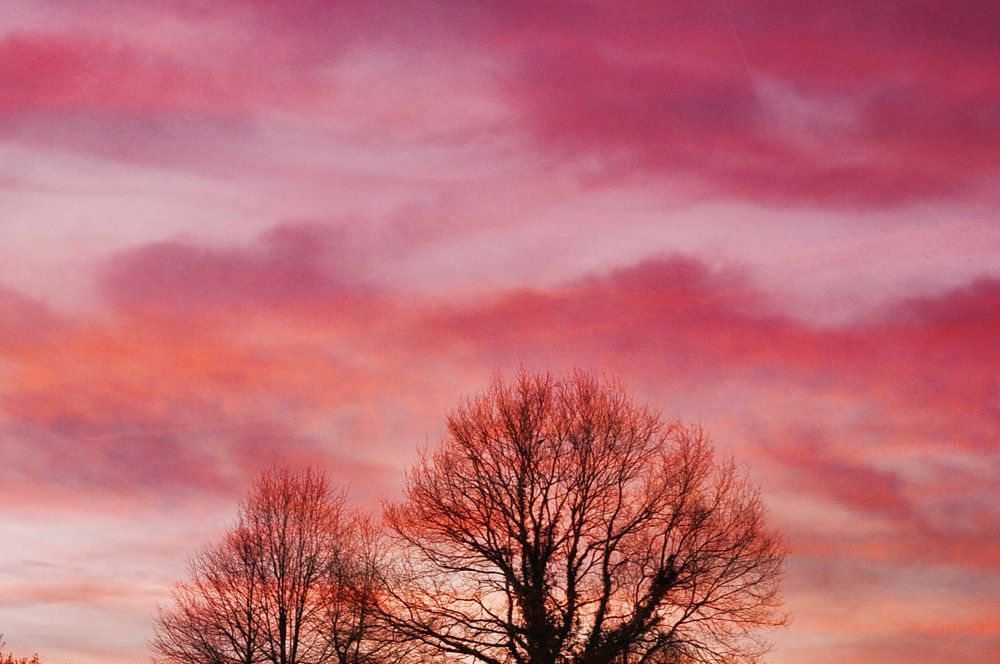 Une photo avec un super ciel. Les nuages sont colorés en rose par le soleil couchant. Les arbres dénudés du parc trahissent l'hiver. J'ai beaucoup de photos de ciels magnifiquement colorés, mais je ne sais pas si elles sont belles sur le mur.