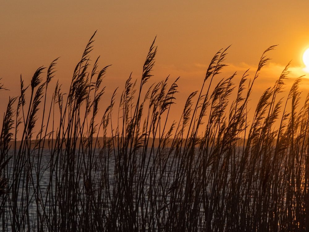 Coucher de soleil sur la mer avec des roseaux et un soleil rougeoyant