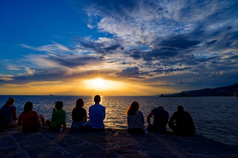 Le Molo Audace à Trieste au coucher du soleil, le ciel est baigné dans des tons chauds d'orange profond, d'or et de rose, tandis que le soleil disparaît lentement derrière l'horizon. Sur la jetée même, on aperçoit des silhouettes de personnes qui profitent de la vue, à l'horizon, la mer et le ciel se fondent en une ligne douce. Le…
