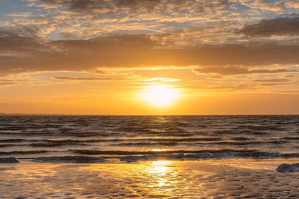 De belles soirées sur les plages néerlandaises lors d'un4 coucher de soleil et de beaux nuages à l'horizon.