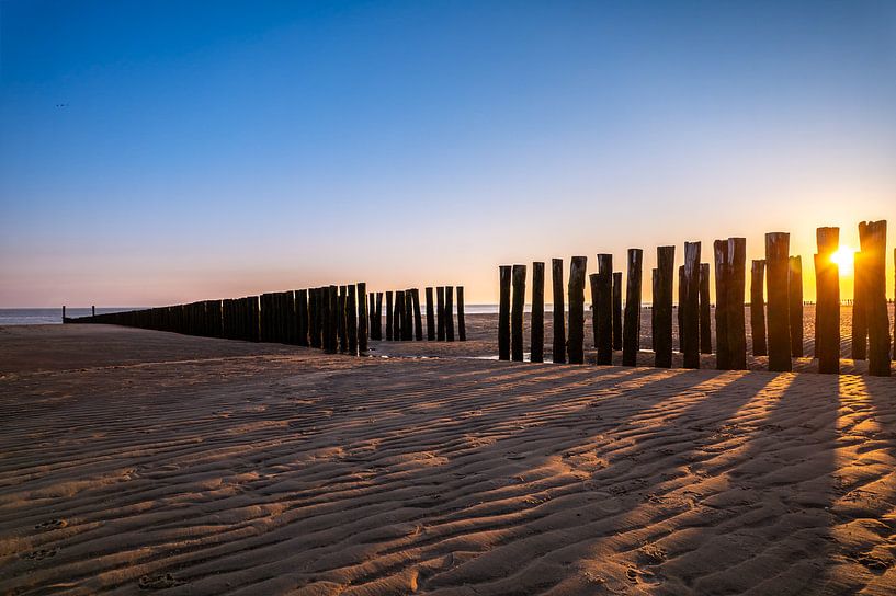 La plage de Zoutelande, en Zélande (NL), au coucher du soleil. Je me tenais à distance d'un brise-lames qui a servi de base à cette photo, le brise-lames étant désormais visible dans son intégralité jusqu'à la ligne de marée. Le soleil couchant était bas et créait des lignes d'ombre qui amélioraient l'image en donnant plus de profondeur à la photo. De plus, les structures dans le sable étaient joliment mises en valeur par le soleil couchant, ce qui complétait l'image pour moi. À mon avis, la plage de Zoutelande est la plus belle, la plus propre et la plus large que j'aie jamais vue. C'est un endroit magnifique et agréable à visiter. Un endroit pour se détendre, toujours agréable de terminer la journée avec un beau coucher de soleil.