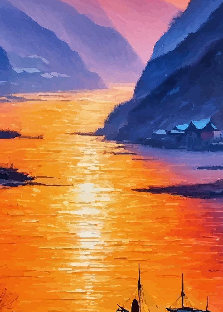 Un coucher de soleil captivant sur le fleuve Yangtze, les teintes dorées du soleil couchant se reflétant sur les eaux calmes. Un petit village à l'architecture chinoise traditionnelle est niché sur les rives du fleuve, la fumée s'élevant doucement des cheminées. Un grand bateau, qui se déplace lentement, dérive sur le fleuve, ajoutant une impression de mouvement à cette scène sereine. La technique du pastel à l'huile apporte de la texture à l'eau qui coule et un mélange doux au ciel, tandis que les tons chauds du coucher de soleil et les ombres froides du village créent une atmosphère paisible et intemporelle.