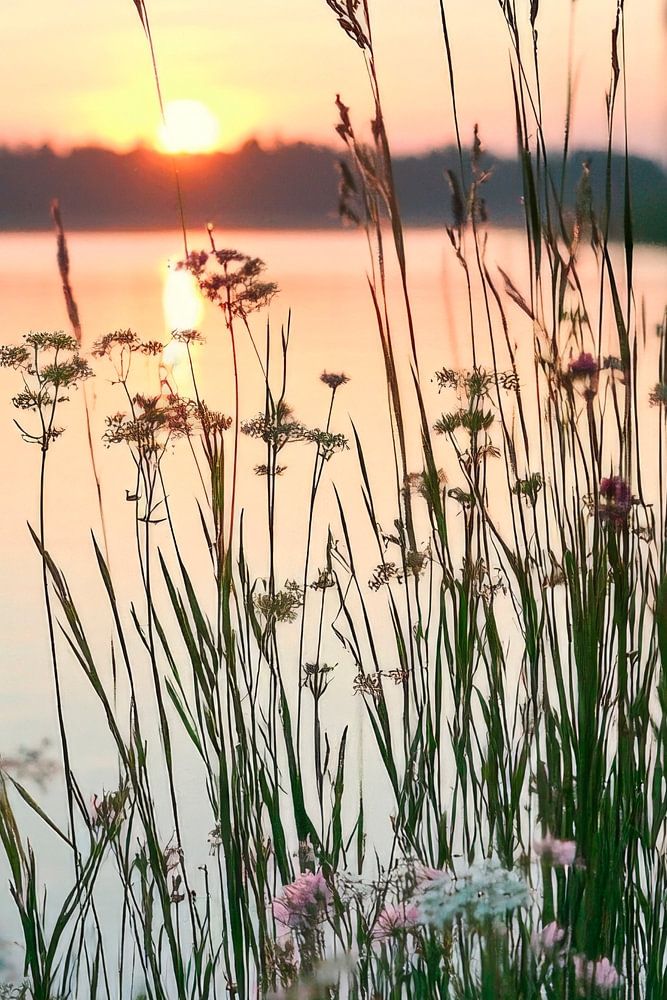 De douces vagues reflètent la lumière délicate du coucher de soleil, tandis que les silhouettes des herbes et des plantes en fleurs s'harmonisent dans des tons doux. L'étreinte chaleureuse du soir et le parfum de la nature créent un décor paisible qui dit adieu en douceur à la journée et accueille la nuit.