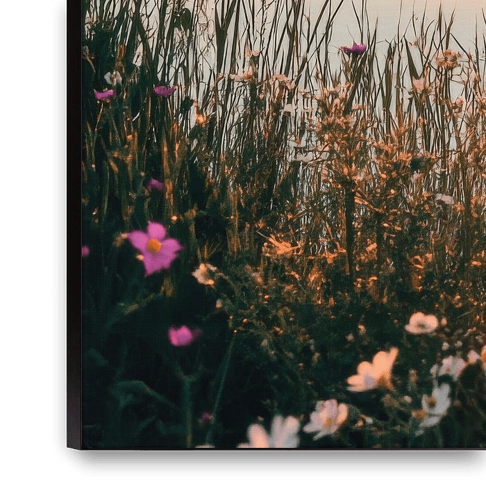De doux rayons de soleil embrassent la surface de l'eau, tandis qu'une mer de fleurs multicolores au premier plan célèbre le moment où le jour se lève. Les silhouettes des hautes herbes encadrent la scène et confèrent une élégance naturelle à l'ensemble harmonieux. Ici, le calme et le jeu des couleurs s'unissent en laissant la nature…