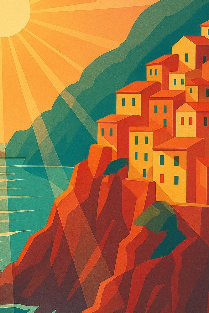 Cette affiche de voyage Cinque Terre célèbre l'esprit vibrant de la célèbre côte ligure de l'Italie. L'illustration présente des maisons colorées à flanc de falaise, illuminées par un coucher de soleil radieux, avec des vagues stylisées et des formes Art déco audacieuses qui ajoutent une touche vintage nostalgique. Connue pour ses villages de bord de mer spectaculaires, Cinque Terre est l'une des destinations les plus appréciées d'Italie, et ce poster en capture l'essence avec chaleur et énergie. Parfaite pour égayer un salon, un espace de travail ou un studio de création, cette affiche allie le charme artistique à l'atmosphère méditerranéenne. Il s'adresse aux voyageurs, aux amateurs de photographie et à ceux qui adorent les villes côtières italiennes. La riche palette de couleurs, composée de rouges ardents, d'oranges flamboyants et de bleus océaniques, évoque les vacances d'été et la beauté intemporelle. Que vous ayez visité Cinque Terre ou que vous rêviez d'en faire l'expérience, cette œuvre d'art apporte un morceau de la Riviera italienne dans votre maison, transformant n'importe quel mur en une fenêtre donnant sur la mer.