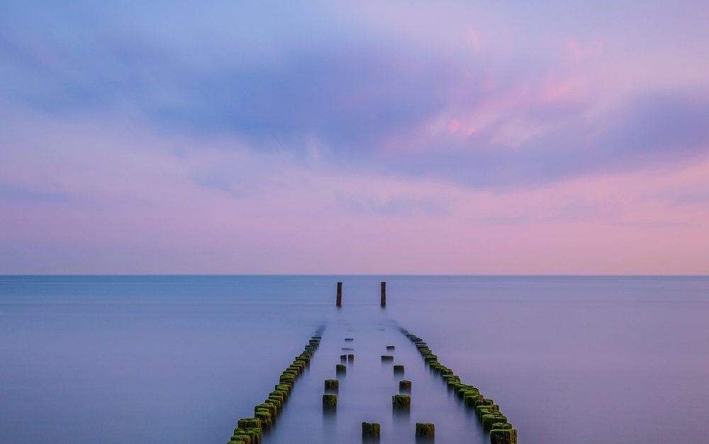 Prise juste avant que le soleil ne se lève et que les nuages ne disparaissent. Vitesse d'obturation longue de 400 secondes pour le mouvement des nuages et la surface serrée de la mer qui donne du calme à la prise de vue et accentue les brise-lames.