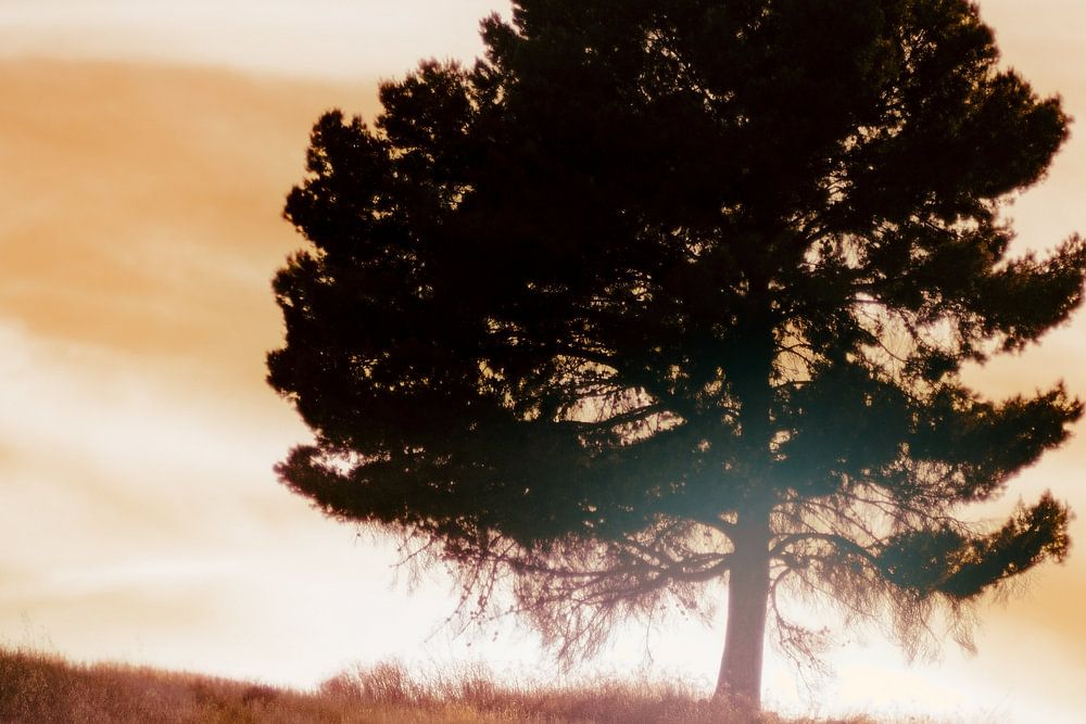 Un coucher de soleil doré par une soirée d'été. Un arbre solitaire sur une colline. Des oiseaux passent dans le ciel.