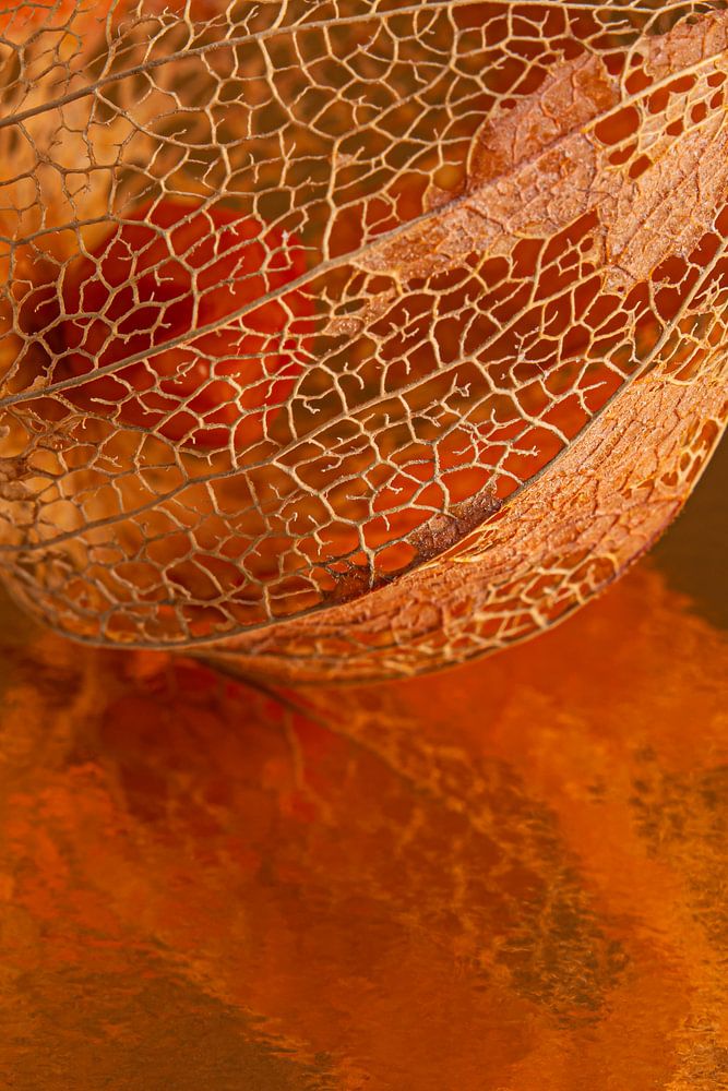 Couleurs chaudes de l'automne : lanterne orange avec reflet abstrait&quot ; est une photo macro d'une lanterne qui s'est déjà partiellement décomposée, à ces endroits on peut voir la belle structure des veines. À certains endroits, on peut encore voir la peau orange de la lanterne, mais elle est si fine que même ici, la structure des veines est clairement visible. La couleur orange chaude de la lanterne et l'arrière-plan or-beige-brun donnent à cette photo un aspect chaleureux et automnal.
